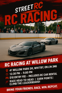 Experience the thrill of Street RC Racing at Willow Park! For just a $10 Entry Fee, racers get to control high-speed RC cars and compete on our exciting outdoor track. Race head-to-head with our sleek black & silver RC cars. Earn points for every win and rise up the online leaderboard!